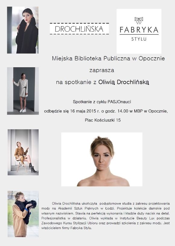 Miejska Biblioteka Publiczna w Opocznie zaprasza na kolejne spotkanie z cyklu "PASJOnauci". W sobotę 16 maja o godzinie 14:00 będziemy gościć pasjonatkę mody, opoczniankę Oliwię Drochlińską.