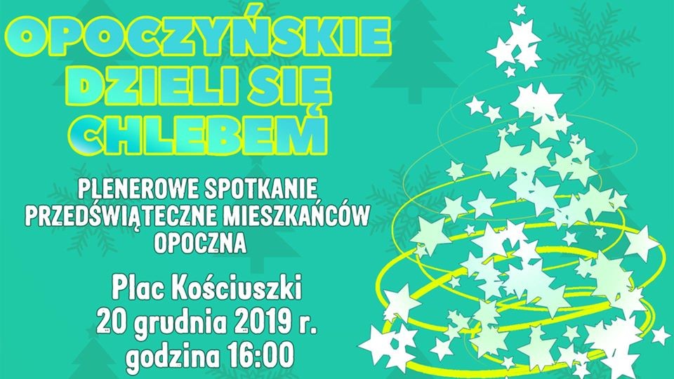 Gmina Opoczno zaprasza mieszkańców Gminy Opoczno na plenerowe spotkanie przedświąteczne pod hasłem "Opoczyńskie Dzieli się Chlebem", które odbędzie się 20 grudnia 2019 roku o godzinie 16:00 na Placu Kościuszki