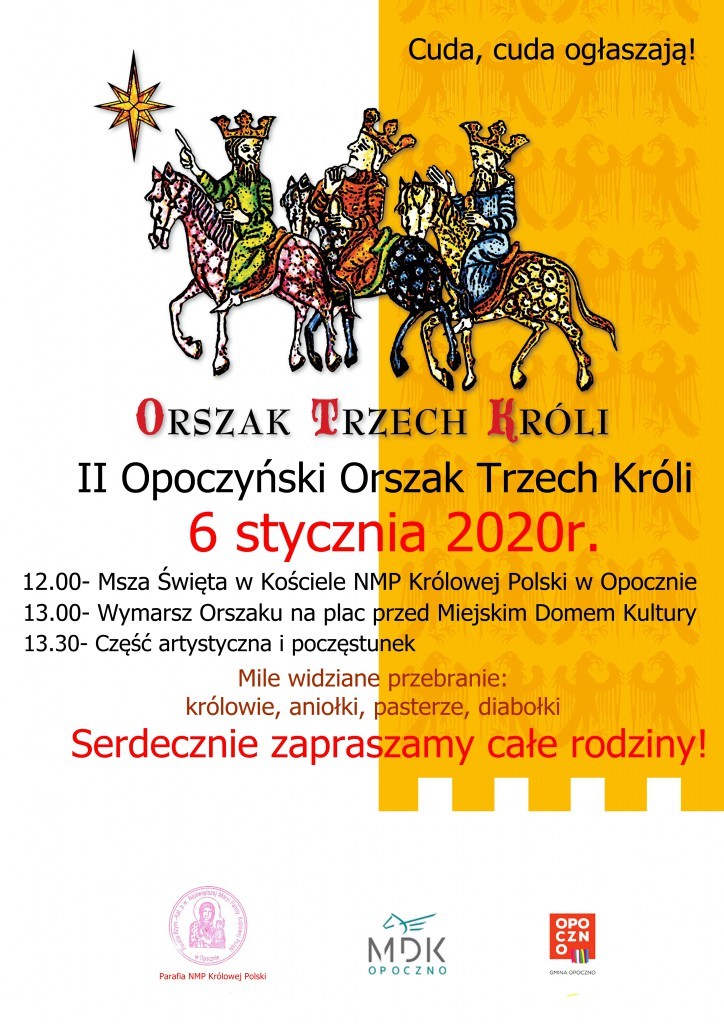 O godz. 12.00 odprawiona zostanie Msza Św. w kościele pw. NMP Królowej Polski, przy ul. Granicznej. Po niej przemarsz Orszaku ulicami Opoczna przed Miejski Dom Kultury, gdzie od godz. 13.30 rozpocznie się część artystyczna.