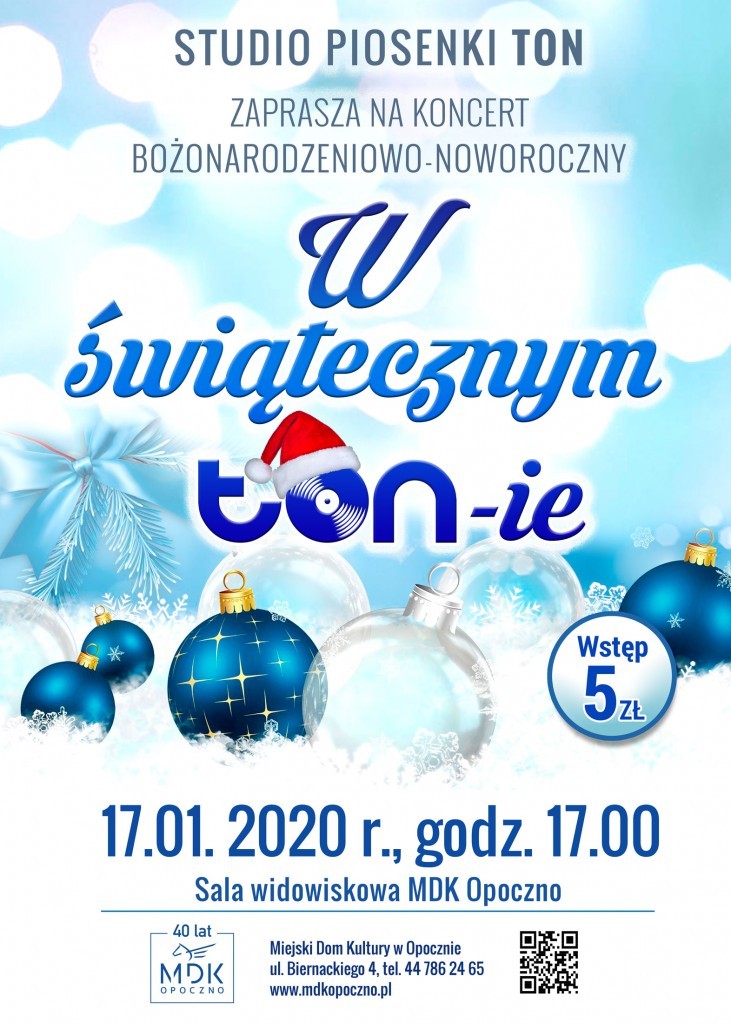 Miejski Dom Kultury w Opocznie zaprasza na koncert bożonarodzeniowo - noworoczny: „W świątecznym TON-ie” w wykonaniu dzieci i młodzieży ze Studia Piosenki TON, który odbędzie się już 17 stycznia (piątek), o godz. 17.00, w Miejskim Domu Kultury.