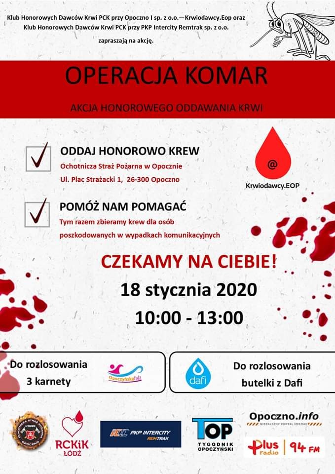 Klub Honorowych Dawców Krwi PCK przy Opoczno 1 Sp. z o. o. oraz Klub Honorowych Dawców Krwi PCK przy PKP Remtrak Sp. z o. o. zapraszają na akcję honorowego oddawania krwi, która odbędzie się 18 stycznia 2020 roku.