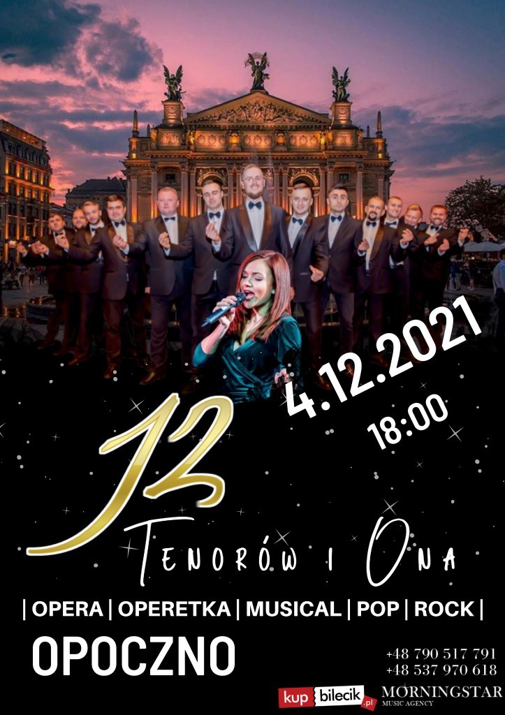 Serdecznie zapraszamy do Miejskiego Domu Kultury 4 grudnia (sobota) o godz. 18.00 na niezapomniane muzyczne widowisko pt. „12 Tenorów i Ona”, w którym wezmą udział tenorzy z grupy „The 12 Tenor's" i zjawiskowa wokalistka - Oksana Karayim - solistka światowych scen oraz laureatka międzynarodowych konkursów obdarzona jedynym w swoim rodzaju głosem.
