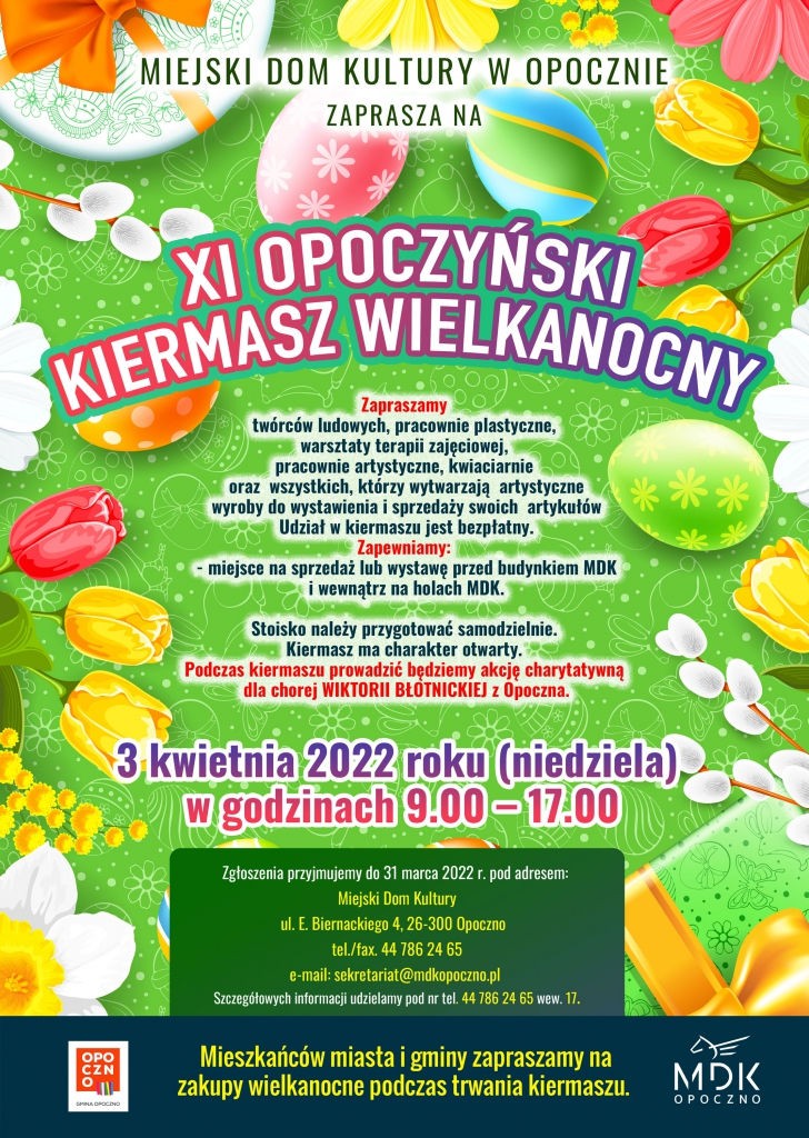 Miejski Dom Kultury w Opocznie serdecznie zaprasza na XI Opoczyński Kiermasz Wielkanocny, który odbędzie się już 3 kwietnia (niedziela) w godz. 9.00-17.00 w MDK.