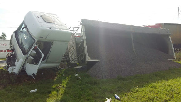 Wielką nieodpowiedzialnością wykazał się 47 letni nietrzeźwy kierowca ciągnika siodłowego marki Scania z naczepą, który podczas wyładunku kruszywa z naczepy doprowadził do jej wywrócenia.