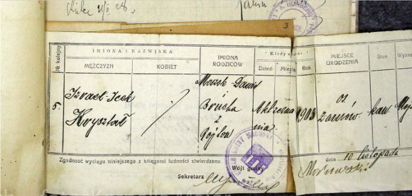 - Pierwszy raz usłyszałem o Panu Izraelu Krysztale w 2014 roku, kiedy Nechemia Pinkusewicz z Izraela zwrócił się do mnie z prośbą o pomoc w napisaniu artykułu o Ocalałym i Żarnowie - mówi Andrzej Śliwka. - Dzięki wsparciu i serdeczności dziennikarza, regionalisty, a jednocześnie Wójta Gminy Żarnów dr. Krzysztofa Nawrockiego udało się przeprowadzić kwerendę w archiwum. Niestety nie natrafiliśmy na akt urodzenia Izraela Kryształa. Jednakże brak tego dokumentu nie był czymś niezwykłym, ponieważ w tamtym okresie często akt urodzenia spisywany był dopiero podczas gromadzenia zaświadczeń niezbędnych do zawarcia małżeństwa.