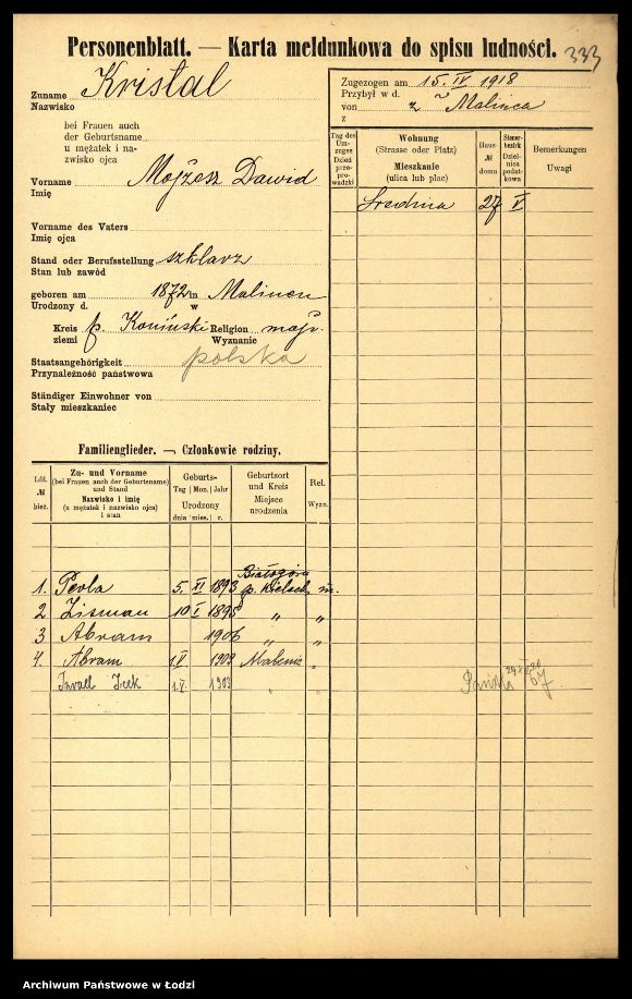 Karta meldunkowa Izraela Krzyształa z Łodzi