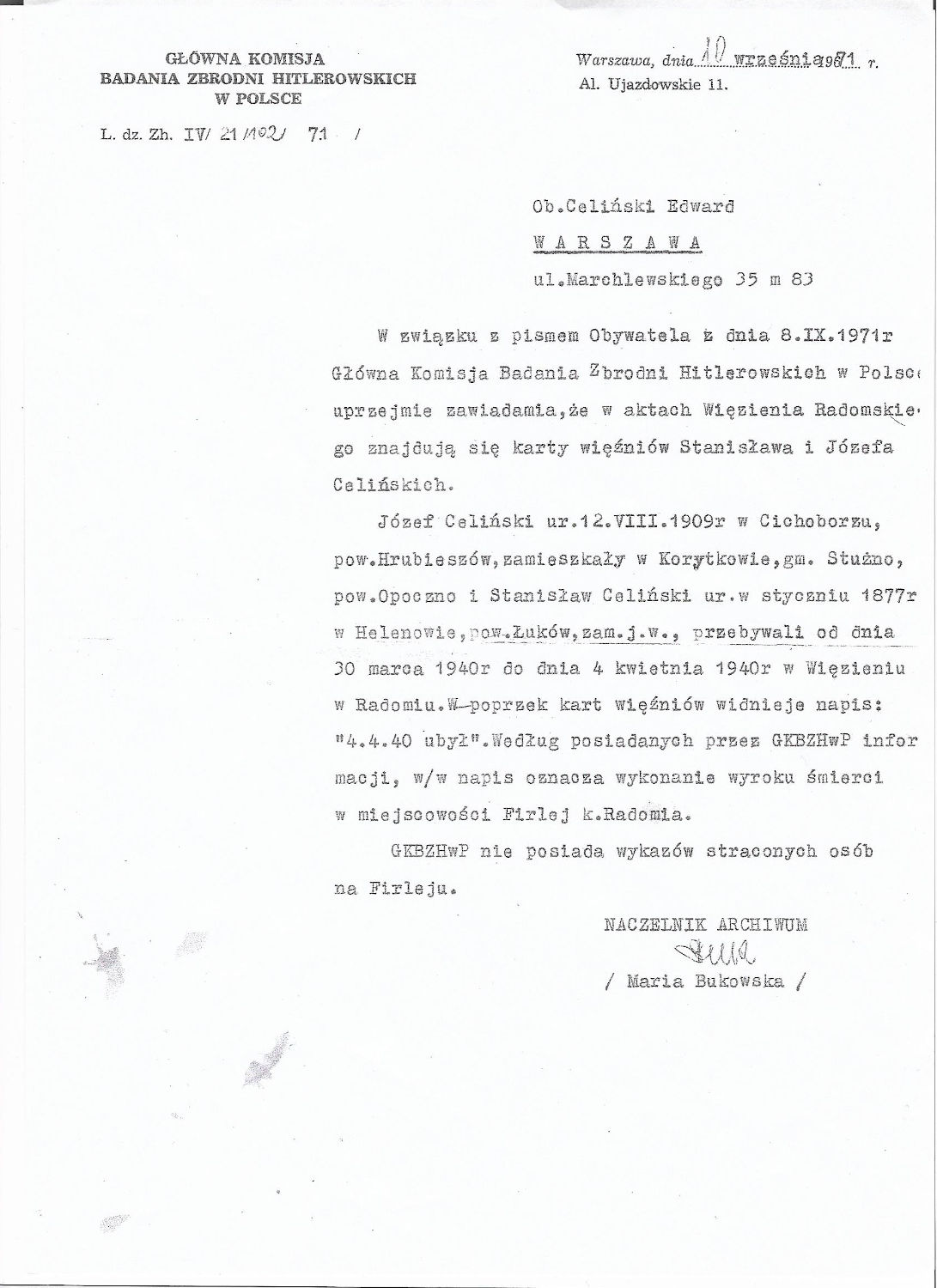 Akta z przesłuchań więźniów więzienia na Firleju, w tym z przesłuchań Stanisława i Józefa Celińskich nie zachowały się. Prawdopodobnie zostały zniszczone przez Niemców podczas wycofywania się z Radomia. Jednakże z dostarczonych do redakcji dokumentów wynika, że w 1971 roku ówczesna Główna Komisja Badania Zbrodni Hitlerowskich w Polsce była w posiadaniu akt Więzienia Radomskiego, w których znajdują się karty więźniów Stanisława i Józefa Celińskich. Komisja nie posiadała natomiast wykazów osób straconych na Firleju, jednak jej zdaniem napisy „4.4.40 ubył”, sporządzone w poprzek kart więźniów, świadczą o wykonaniu wyroku śmierci.