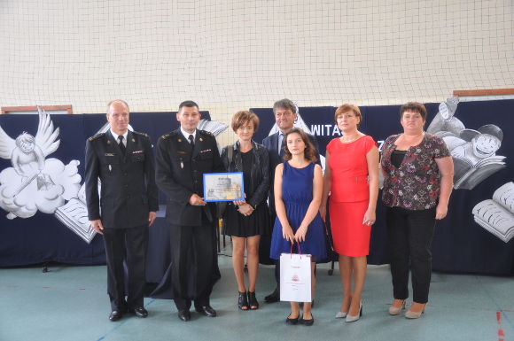 Od lewej stoją: bryg. Andrzej Śpiewak – naczelnik wydziału operacyjnego KP PSP w Opocznie, bryg. Józef Pacan - Zastępca Komendanta Powiatowego PSP w Opocznie, opiekun -Monika Bakalarz, Wójt Gminy Żarnów – dr Krzysztof Nawrocki, laureat konkursu - Aleksandra Pękala, Dyrektor Szkoły Podstawowej w Żarnowie - Barbara Kantor, mama Aleksandry - Emilia Pękala.