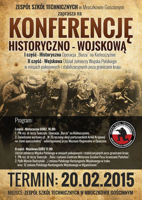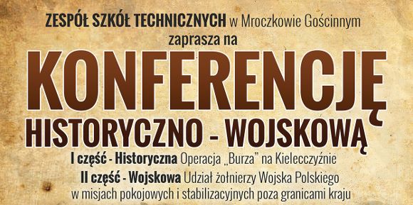 Zespół Szkół Technicznych w Mroczkowie Gościnnym w dniu 20 lutego 2015 roku organizuje konferencję historyczno – wojskową poświęconą Operacji „Burza” na Kielecczyźnie oraz misjom pokojowym i stabilizacyjnym Wojska Polskiego poza granicami kraju. Konferencja przeznaczona jest dla pasjonatów historii i wojskowości, a także będzie dodatkowym wsparciem dla nauczycieli przedmiotów: historia i edukacja dla bezpieczeństwa.