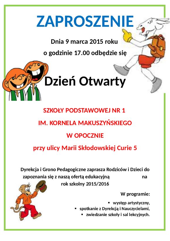 Dyrekcja oraz Grono Pedagogiczne Zespołu Szkół Samorządowych zapraszają dzieci i rodziców na Dzień Otwarty w Szkole Podstawowej nr 1, który odbędzie się dnia 9 marca 2015 roku o godzinie 17.00.