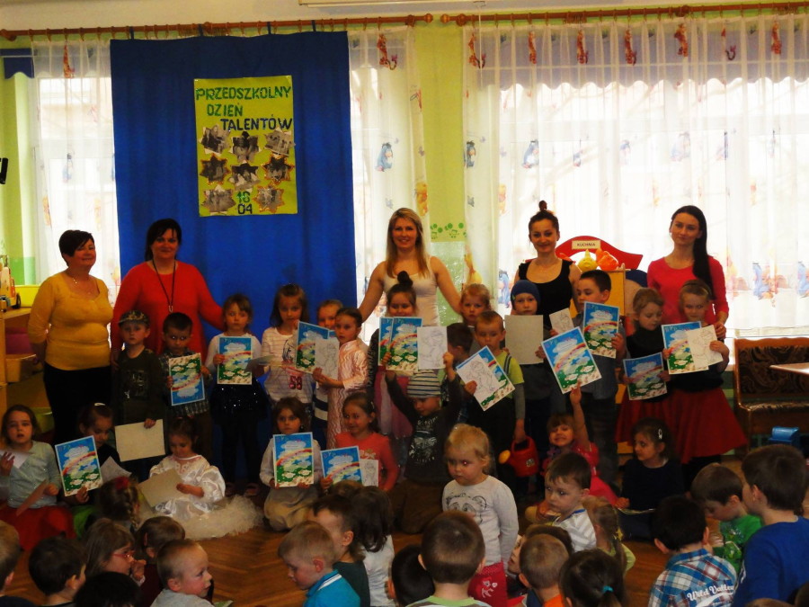 Ukoronowaniem „Przedszkolnego dnia talentów” było wręczenie dyplomów przez Dyrektor Małgorzatę Bartoszek i panią Jolę Grygiel - organizatorkę konkursu oraz prezentów przez dyrektorkę Małgorzatę Bartoszek oraz wspólna fotografia wszystkich uczestników.