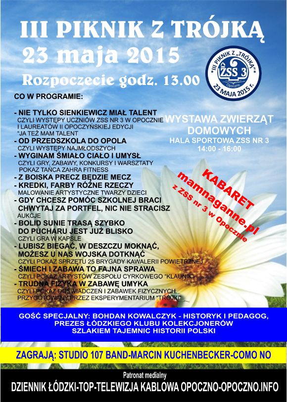 Zespół Szkół Samorządowych nr 3 zaprasza na III Piknik Rodzinny z Trójką, który odbędzie się 23. maja 2015 roku.