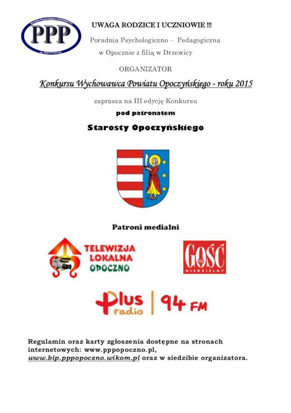 Poradnia Psychologiczno - Pedagogiczna w Opocznie z filią w Drzewicy zaprasza na III edycję konkursu "Wychowawca Powiatu Opoczyńskiego roku 2015". Konkurs swoim patronatem objął Starosta Opoczyński Józef Róg.