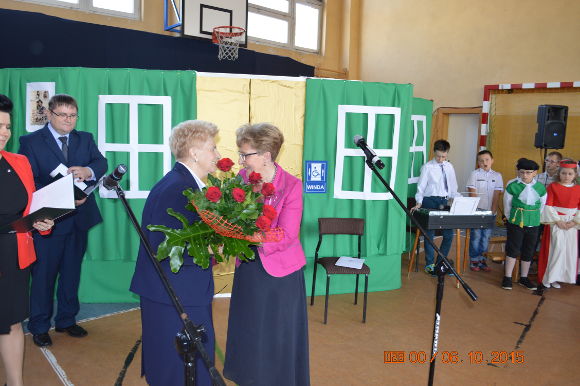Następnie za pocztami sztandarowymi i insygniami królewskimi nastąpił przemarsz do Sali gimnastycznej, gdzie miała miejsce dalsza część uroczystości. Pani dyr. Urszula Tecław poinformowała zebranych, że decyzją Prezydenta Rzeczypospolitej Polskiej p. Andrzeja Dudy, p. Zofii Dębowskiej został przyznany Srebrny Krzyż Zasługi. O dokonaniach i działalności p. Zofii opowiedział pan dyr. Marek Śmigiel. Uroczystego wręczenia odznaczenia dokonał Wicewojewoda Łódzki Jarosław Klimas wraz z posłami.