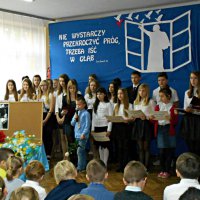 Po mszy uczestnicy przeszli do szkoły, gdzie przygotowana została impreza okolicznościowa otworzona przez panią dyrektor Małgorzatę Kałużyńską.