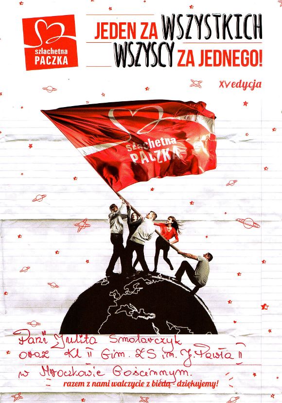Szlachetna Paczka łączy ludzi zgodnie z ideałem „Jeden za wszystkich, wszyscy za jednego”. Do tej wspaniałej akcji po raz pierwszy włączyli się uczniowie klasy 2 gimnazjum z Zespołu Szkół im. Jana Pawła II w Mroczkowie Gościnnym wraz z wychowawczynią p. Julitą Smolarczyk, przygotowując ogromną paczkę dla wybranej losowo rodziny.