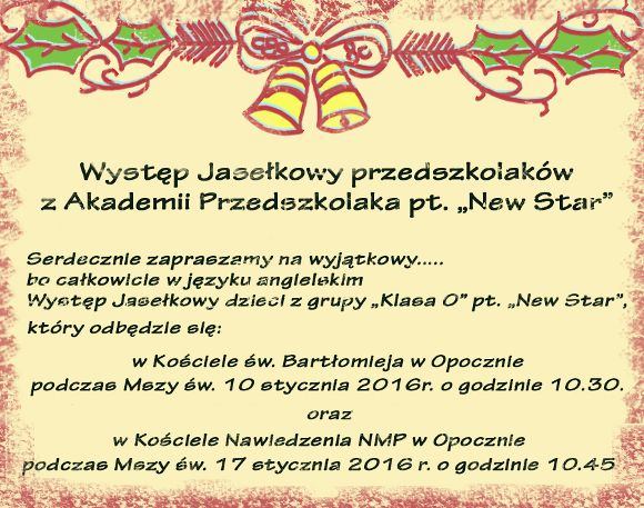 10 stycznia 2016 roku, podczas mszy o godzinie 10:30 w Kolegiacie p.w. św. Bartłomieja oraz 17 stycznia 2016 w kościele p.w. Nawiedzenia Najświętszej Marii Panny w trakcie mszy o godznie 10:45, odbędą się wyjątkowe Jasełka po angielsku w wykonaniu przedszkolaków z Akademii Przedszkolaka.