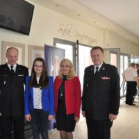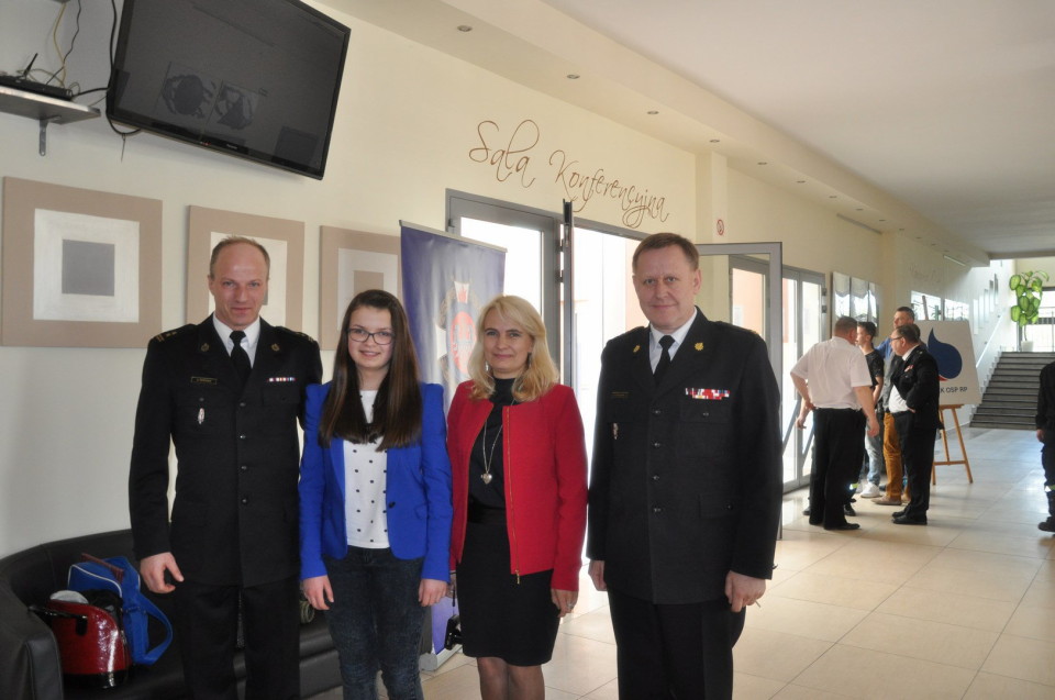 Julia Składowska z opiekunem i Komendantem Powiatowym PSP