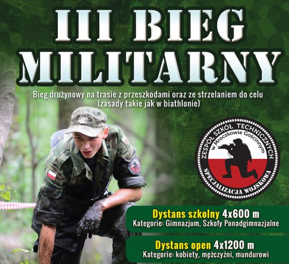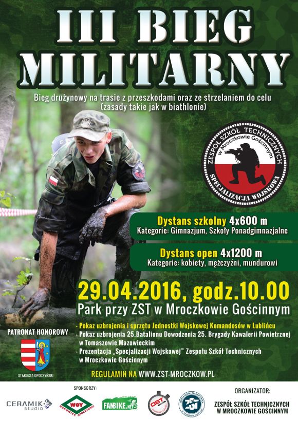 Zespół Szkół Technicznych w Mroczkowie Gościnnym zaprasza na III Bieg Militarny pod Patronatem Honorowym Starosty Opoczyńskiego oraz pokaz uzbrojenia i sprzętu Jednostki Wojskowej Komandosów w Lublińcu i żołnierzy 25 Batalionu Dowodzenia 25 BKPow. w Tomaszowie Mazowieckim.