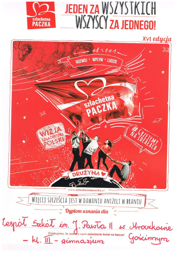 Po raz drugi klasa 3 gimnazjum z Zespołu Szkół im. Jana Pawła II w Mroczkowie Gościnnym wraz z wychowawczynią Julitą Smolarczyk oraz rodzicami przyłączyła się do akcji "Szlachetna Paczka".