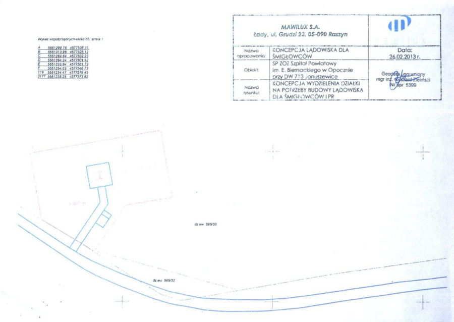"Nabycie od Agencji Nieruchomości Rolnych w Łodzi części działki oznaczonej numerem 595/33 położonej w Januszewicach gm. Opoczno (oznaczonej linią czerwoną na załączniku graficznym - Koncepcja Lądowiska Dla Śmigłowców) stało się niezbędne, ponieważ jest to jedyna możliwa do pozyskania działka, na której może być zlokalizowane całodobowe lądowisko dla śmigłowców ratunkowych wraz z infrastrukturą, spełniające wszystkie wymogi określone w Rozporządzeniu Ministra Zdrowia z dnia 3 listopada 2011r. w sprawie szpitalnego oddziału ratunkowego, w tym czas dojazdu poniżej 5 minut ze Szpitalnego Oddziału Ratunkowego do lądowiska."