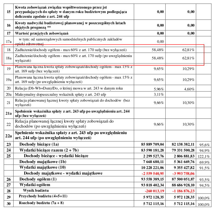 Z dokumentacji zawartej w BIP wynika, iż łączna kwota zadłużenia Gminy Opoczno wynosi 54 960 144,59 zł i była wyższa od planowanego o 243 519,51 zł.