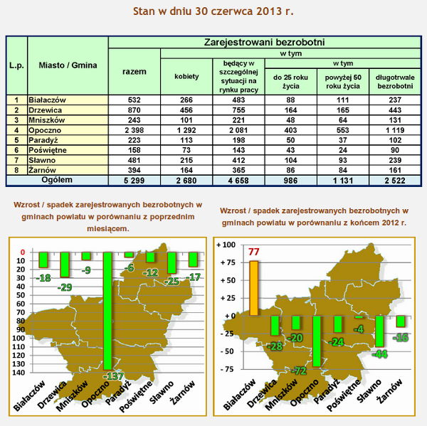 Wg raportu Powiatowego Urzędu Pracy w Opocznie w czerwcu 2013 roku ilość osób zarejestrowanych w jako bezrobotne, nieznacznie spadła. Ilość osób bezrobotnych wynosi 5299 i jest mniejsza niż w maju o 253 osoby.