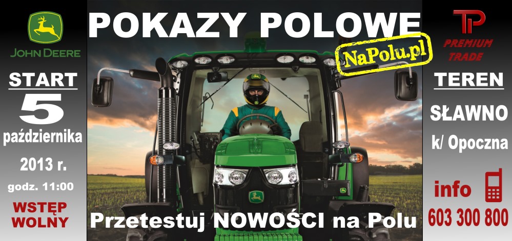 Firma Premium Trade z Kozenina, Autoryzowany Dealer John Deere, zaprasza 5 października 2013 roku do Sepna-Radoni na pokazy polowe John Deere DEMO TOUR "Przetestuj NOWOŚCI na polu"