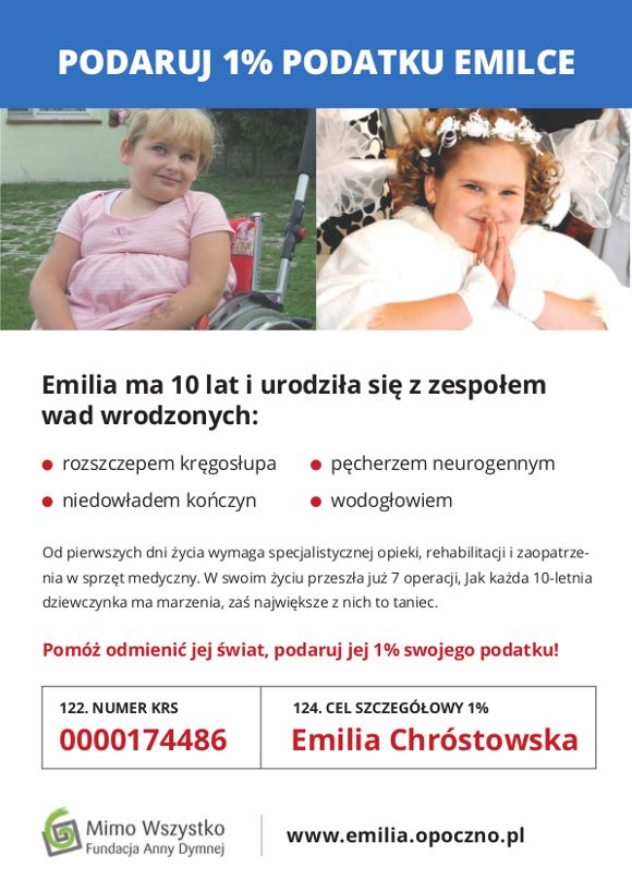 Emilia ma 10 lat i urodziła się z zespołem wad wrodzonych. Od pierwszych dni życia wymaga specjalistycznej opieki, rehabilitacji i zaopatrzenia w sprzęt medyczny. W swoim życiu przeszła już 7 operacji.