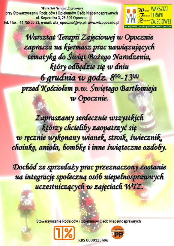 Warsztat Terapii Zajęciowej w Opocznie zaprasza na kiermasz prac nawiązujących tematyką do Świąt Bożego Narodzenia, który odbędzie się 6 grudnia w godz. 8:00-13:00 przed kościołem p.w. Świętego Bartłomieja w Opocznie.