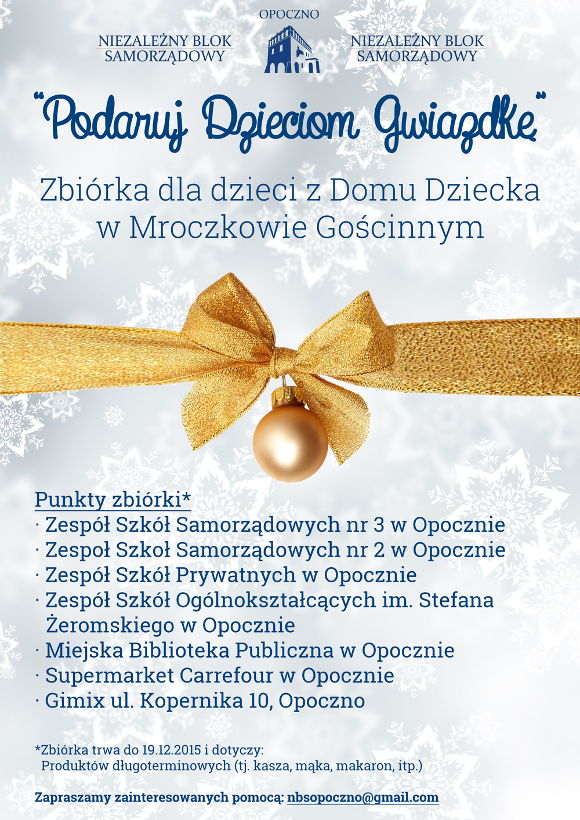 Niezależny Blok Samorządowy zaprasza do udziału w akcji Podaruj Dzieciom Gwiazdkę.