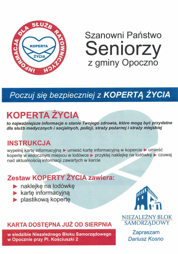 Kopertę życia można odebrać w siedzibie Niezależnego Bloku Samorządowego, usytuowanym przy pl. Kościuszki 2.