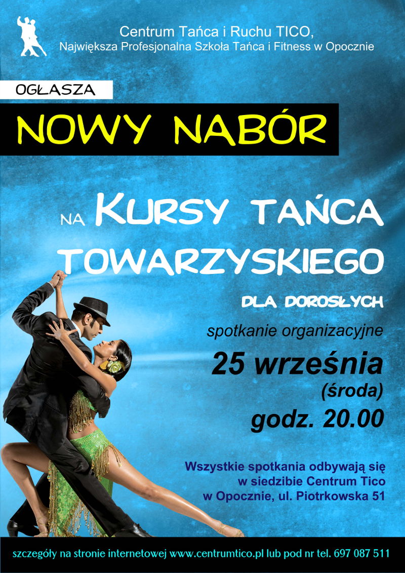 Zainteresowanych zapraszamy 25 września (środa) o godz. 20.00 na ul. Piotrkowską 51 do siedziby Centrum Tańca i Ruchu TICO. Uczestników zajęć obowiązuje obuwie na zmianę.
