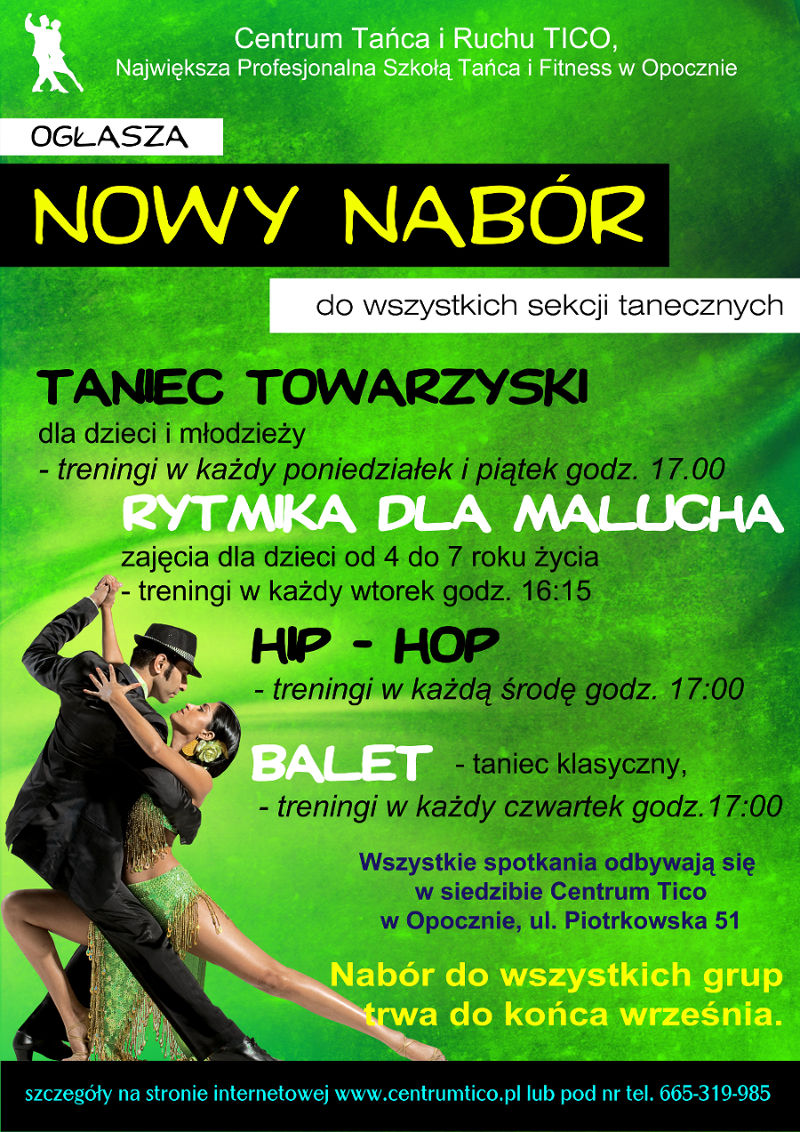 Szczegółowa oferta Centrum Tańca i ruchu dostępna jest pod adresem www.centrumtico.pl , w siedzibie Centrum przy ul. Piotrkowskiej 51 w Opocznie (nad sklepem PEPCO, wejście z boku budynku). Wszelkie informacje pod numerami telefonów: 665 319 985 lub 697 087 511.