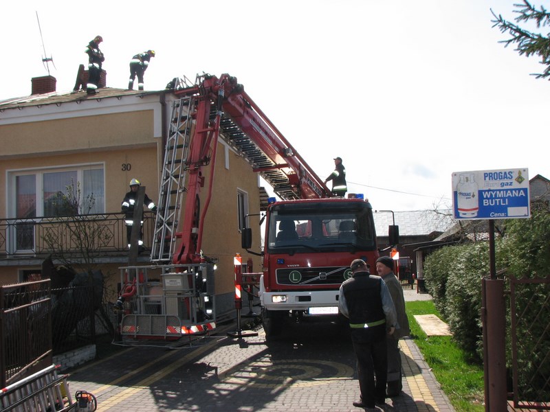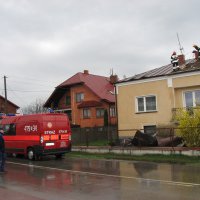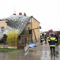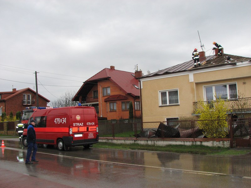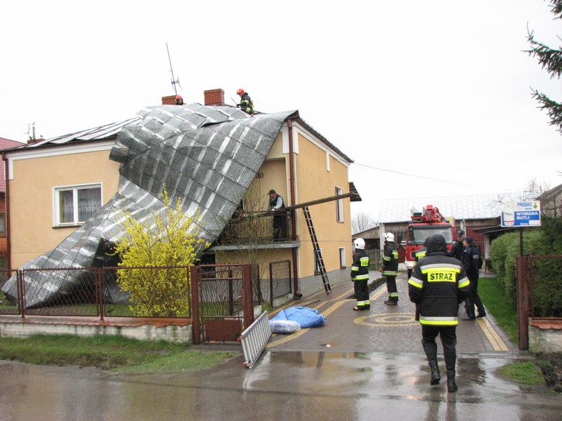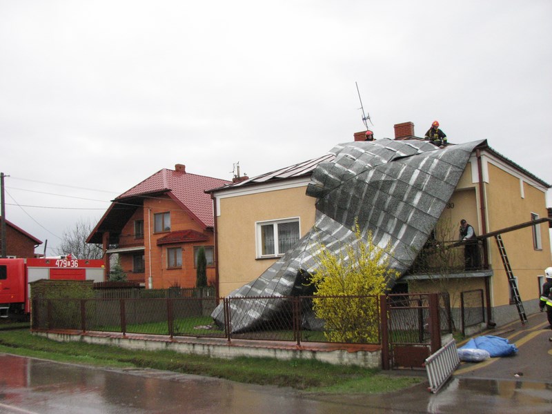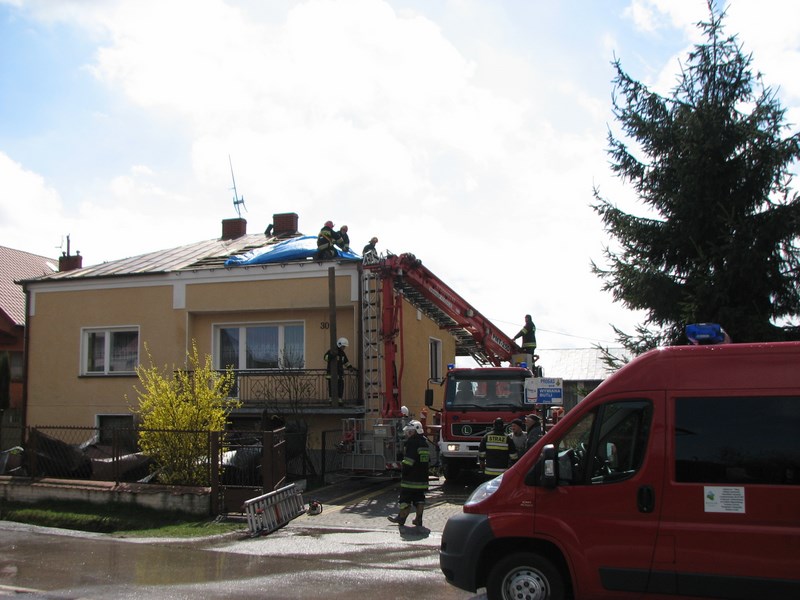 Natychmiast do akcji zadysponowanych zostało 6 zastępów straży PSP i OSP. Na miejscu zdarzenia okazało się, że naderwaniu uległo około połowy, tj. 100 m2 powierzchni dachu płaskiej blachy stalowej. Strażacy po usunięciu zagrażających elementów blachy i wzmocnieniu pozostałej powierzchni dachu przystąpili do przykrycia plandekami odkrytej połaci dachu. W zdarzeniu na szczęście nic nikomu się nie stało. Nie naruszona została również konstrukcja dachu. Nie było potrzeby ewakuacji osób mieszkających w budynku. O zdarzeniu poinformowany został Nadzór Budowlany. W chwili obecnej trwa uszczelnianie dachu plandekami. Szacowanie strat nastąpi po zakończeniu działań.