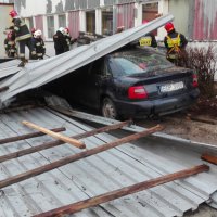 Uszkodzeniu uległ także samochód osobowy marki Audi A4, na który spadły elementy zerwanej konstrukcji.