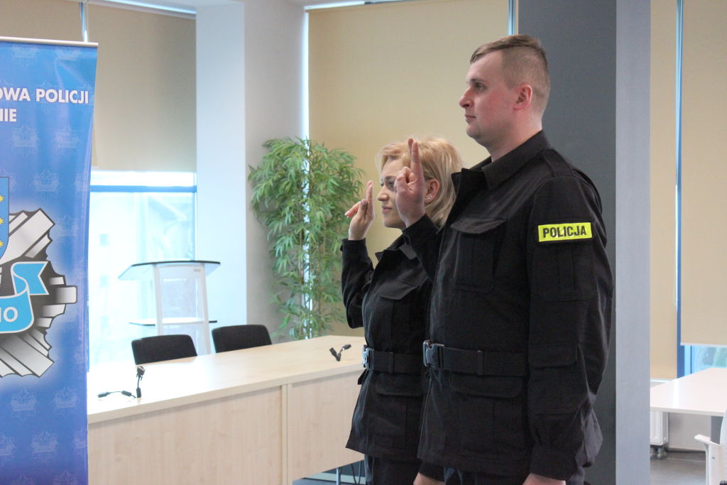 W Komendzie Powiatowej Policji w Opocznie nowo przyjęci policjanci post. Monika Stępniak oraz post. Michał Brola, przed Komendantem Powiatowym Policji w Opocznie insp. Konradem Kobierskim, w obecności kadry kierowniczej opoczyńskiej jednostki policji złożyli ślubowanie.