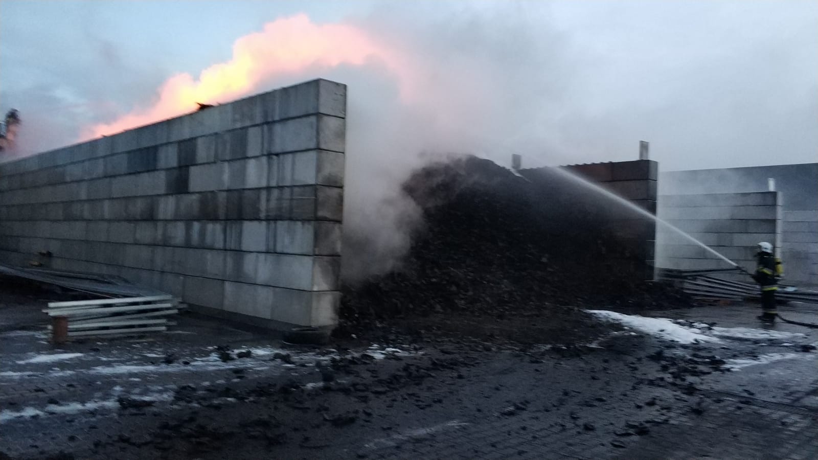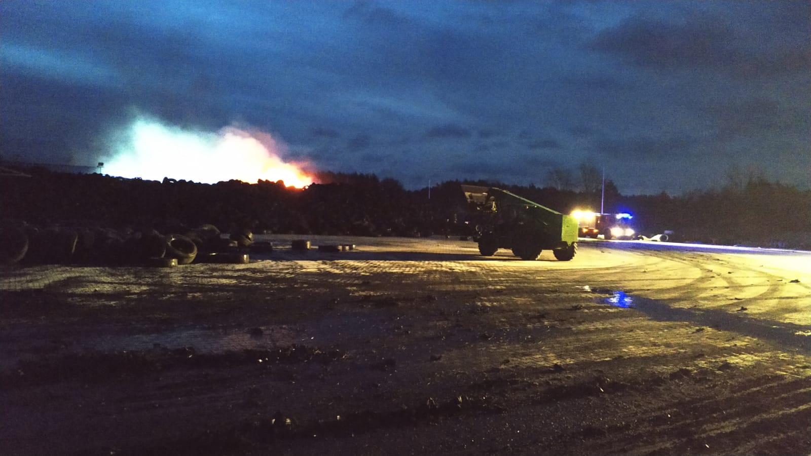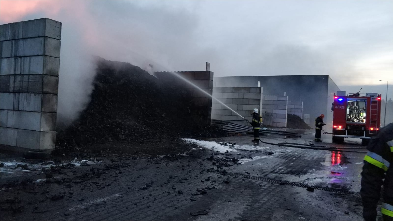 Pożar rozdrobnionych opon w zakładzie przetwarzania opon w Sławnie