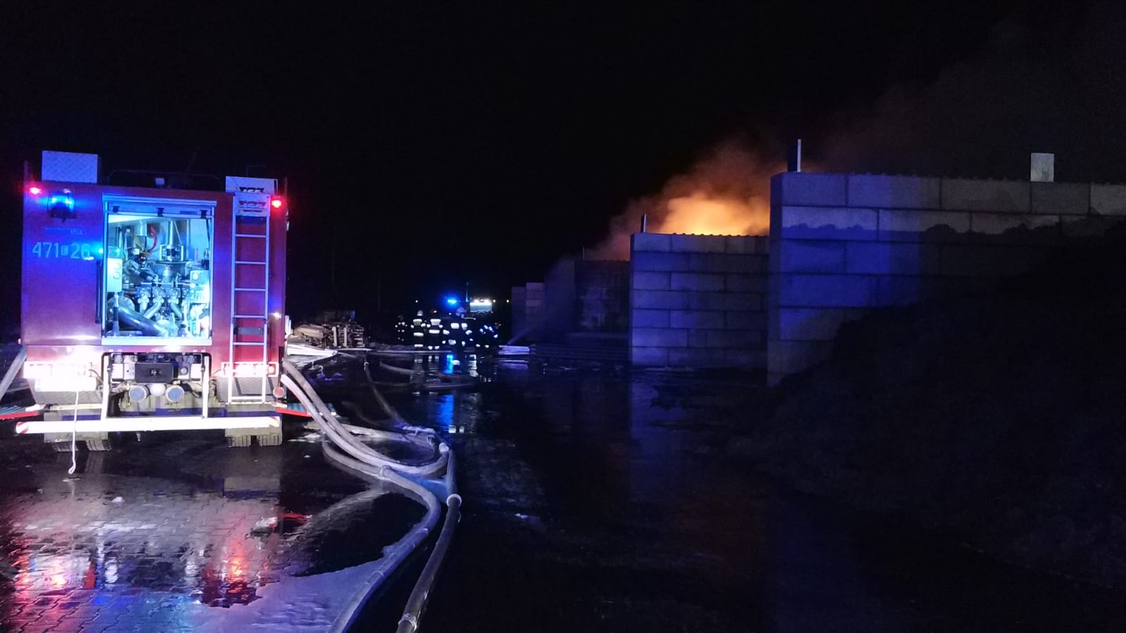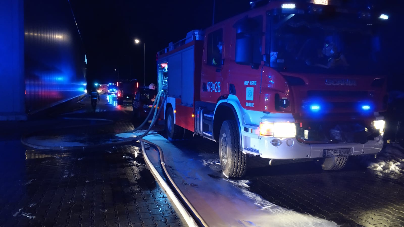 W dniu 17 stycznia br. o godz. 2321 dyspozytor Powiatowego Stanowiska Kierowania PSP w Opocznie otrzymał informację o pożarze opon na terenie zakładu przeróbki opon w Sławnie ul. Leśna. Na miejsce zdarzenia natychmiast zadysponowanych zostało 5 zastępów PSP i 8 zastępów OSP.