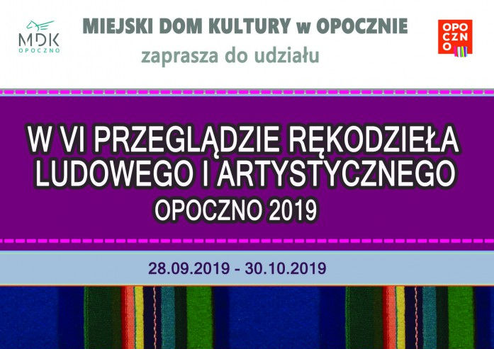 Miejski Dom Kultury w Opocznie przypomina i jednocześnie zaprasza do udziału w VI Przeglądzie Rękodzieła Ludowego i Artystycznego oraz do udziału w IV Konkursie na Pamiątkę z Opoczna.