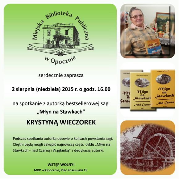Serdecznie zapraszamy na spotkanie z panią Krystyną Wieczorek, która z uwagi na sposób pisania i tematykę twórczości nazywana jest „Reymontem w spódnicy”. Popularność przyniosła jej saga „Młyn na Stawkach. Pani Krystyna to poetka, gawędziarka potrafiąca z właściwą sobie prostotą opowiadać niezwykłe epizody ze swojego życia oraz te przekazywane z pokolenia na pokolenie.