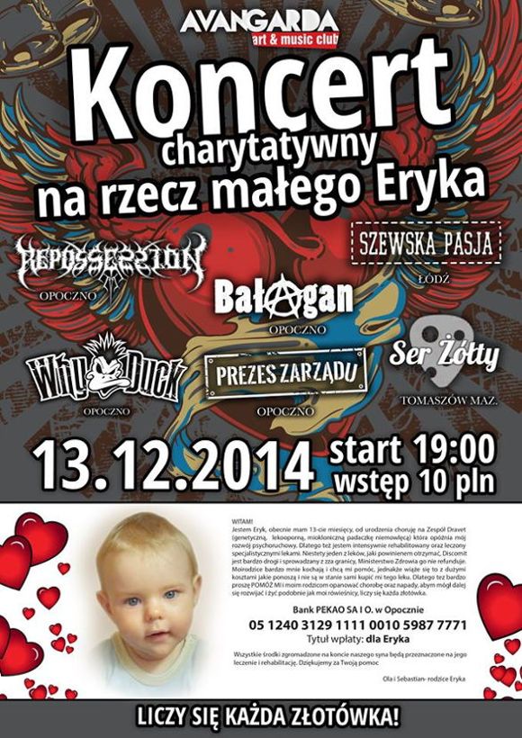 13. grudnia 2014 roku Avangarda art & music club zaprasza na koncert charytatywny na rzecz 13-miesięcznego Eryka chorującego na Zespół Dravet. Na scenie klubu wystąpią: Prezes Zarządu, Bałagan, Repossession, Ser Żółty /band/, Why Duck, Szewska Pasja.