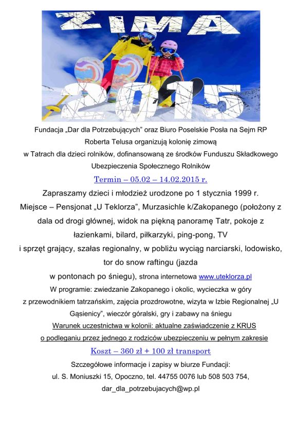 Fundacja „Dar dla Potrzebujących” oraz Biuro Poselskie Posła na Sejm RP Roberta Telusa organizują kolonię zimową w Tatrach dla dzieci rolników, dofinansowaną ze środków Funduszu Składkowego Ubezpieczenia Społecznego Rolników.