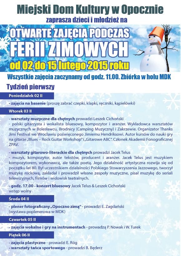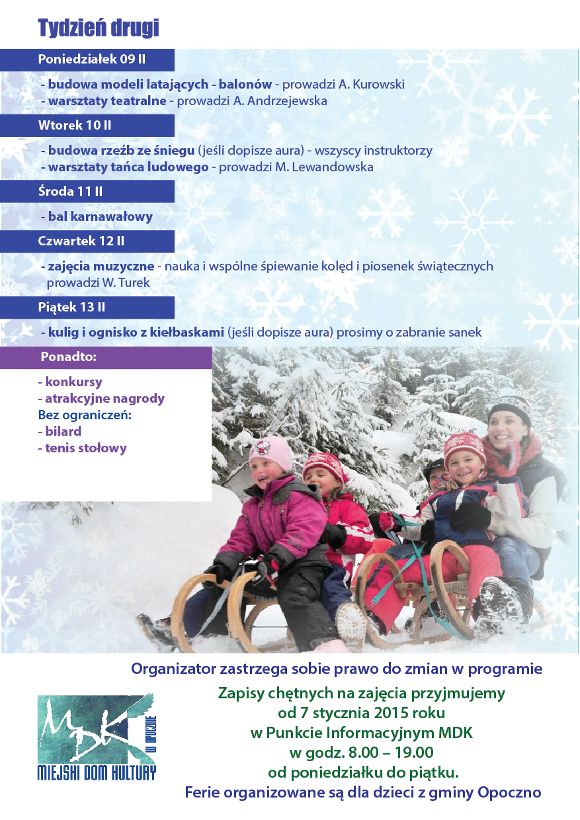 Miejski Dom Kultury w Opocznie zaprasza dzieci i młodzież na otwarte zajęcia podczas ferii zimowych od 02 do 15 lutego 2015 roku. Wszystkie zajęcia zaczynamy od godz. 11.00. Zbiórka w holu MDK.
