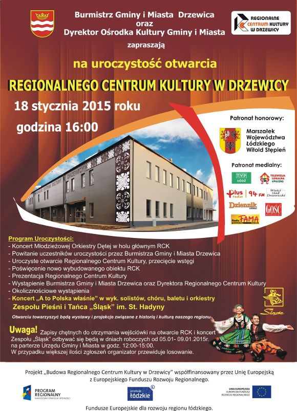 W niedzielę, 18. stycznia 2015 roku, o godzinie 16:00 w Drzewicy odbędzie się uroczyste otwarcie Regionalnego Centrum Kultury w Drzewicy. Gwiazdą wieczoru będzie Zespół Pieśni i Tańca „Śląsk” im. St. Hadyny.