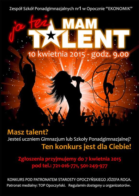 Mamy zaszczyt zaprosić wszystkich gimnazjalistów i uczniów szkól ponadgimnazjalnych do wzięcia udziału II edycji konkursu "Ja Też Mam Talent", który odbędzie się 10 kwietnia 2015 roku w Zespole Szkół Ponadgimnazjalnych nr 1 w Opocznie.