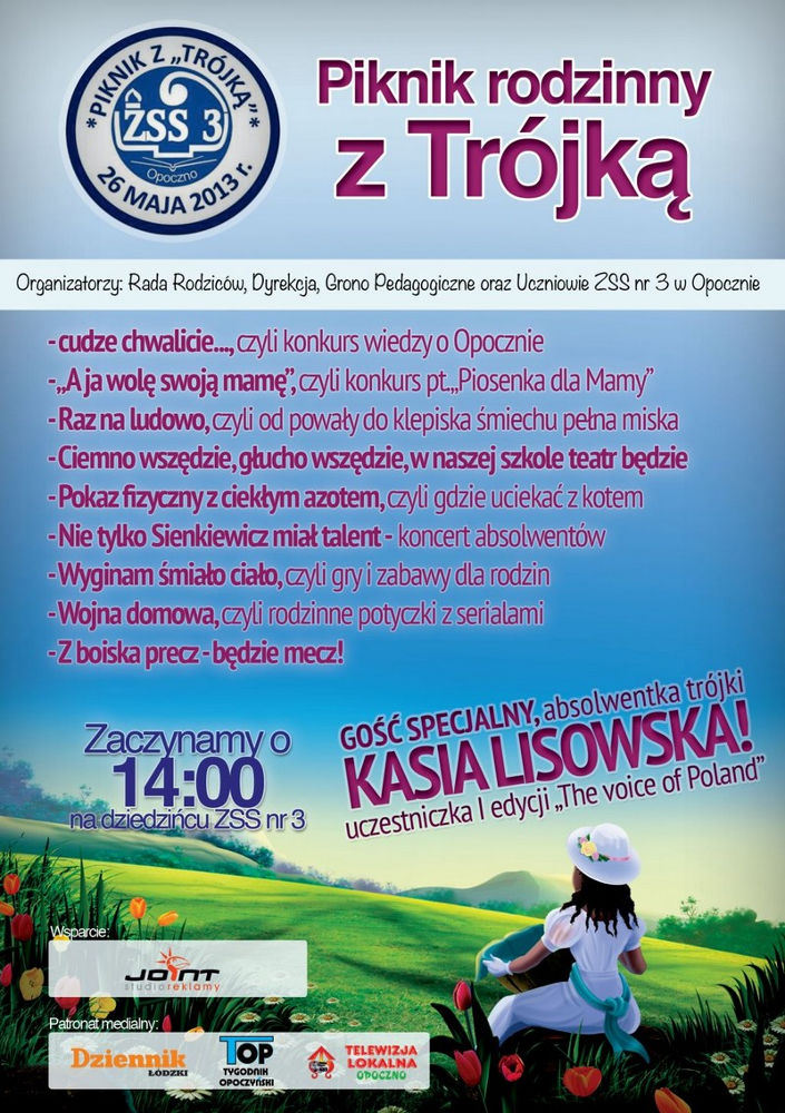 Rada Rodziców, dyrekcja, grono pedagogiczne oraz uczniowie Zespołu Szkół Samorządowych nr 3 w Opocznie zapraszają na "Piknik Rodzinny z Trójką", który odbędzie się 26 maja 2013 roku (niedziela).