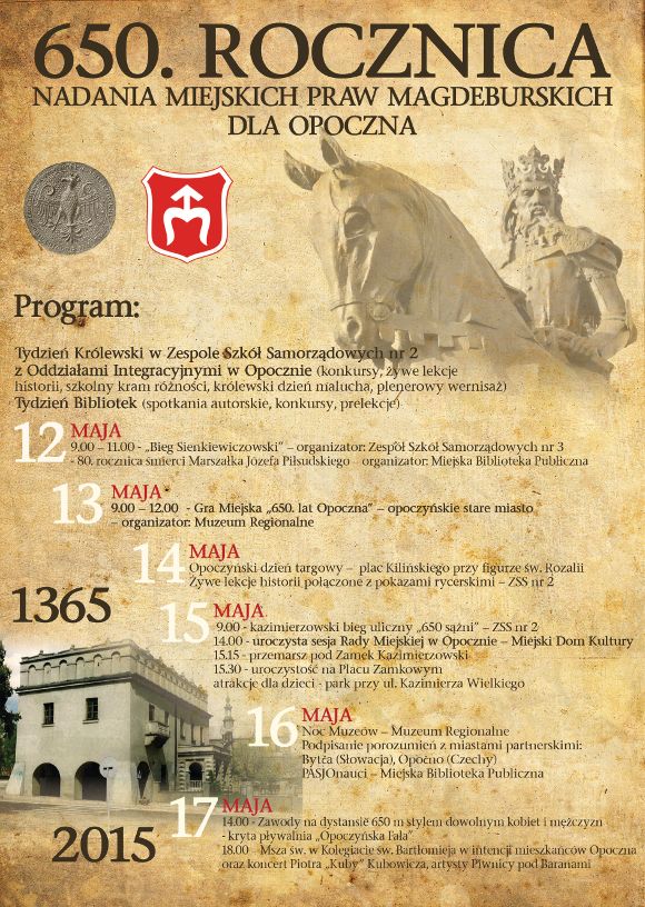 Burmistrz Opoczna Rafał Kądziela zaprasza na obchody 650. rocznicy nadania miejskich praw magdeburskich dla Opoczna.
