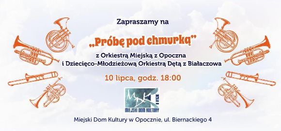 Miejski Dom Kultury oraz Orkiestra Miejska zapraszają wszystkich miłośników muzyki na „Próbę pod chmurką” - plenerowe zajęcia Orkiestry połączone z mini koncertem w wykonaniu członków opoczyńskiej Orkiestry oraz Dziecięco - Młodzieżowej Orkiestry Dętej z Białaczowa.