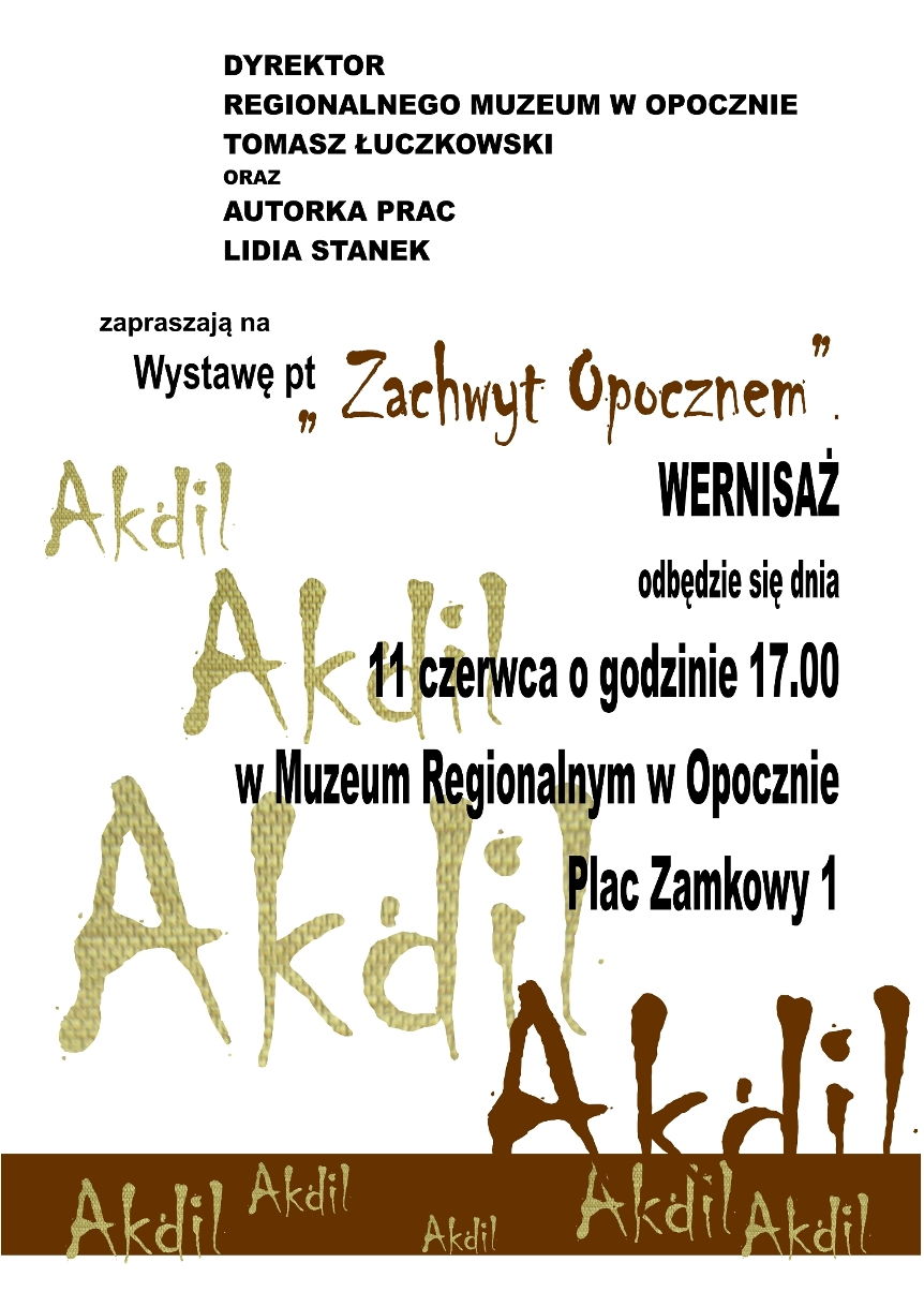 Dyrektor Muzeum Regionalnego w Opocznie oraz autorka prac Lidia Stanek zapraszają na wernisaż wystawy "Zachwyt Opocznem", który odbędzie się 11 czerwca o godzinie 17:00 w sali wystaw czasowych muzeum.